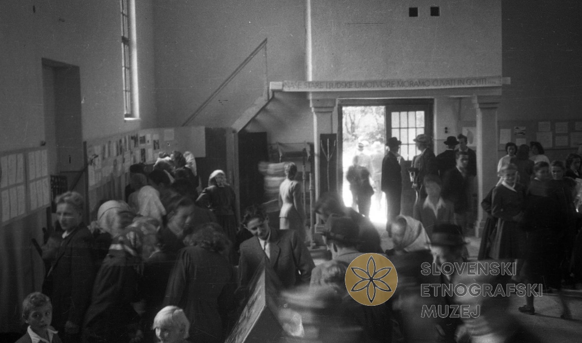 Ljudje na razstavi etnografskege ekipe v Št. Vidu. Teren 5- Št. Vid pri Stični, Radohova vas, Dob-...