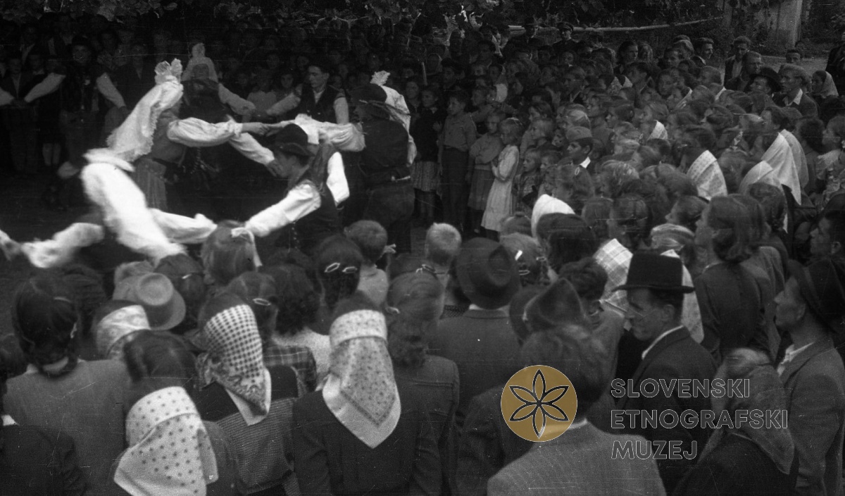 Dekleta pojo pod lipo, fantje se jim bližajo, ljudje gledajo. Teren 5- Št. Vid pri Stični, Radohova...