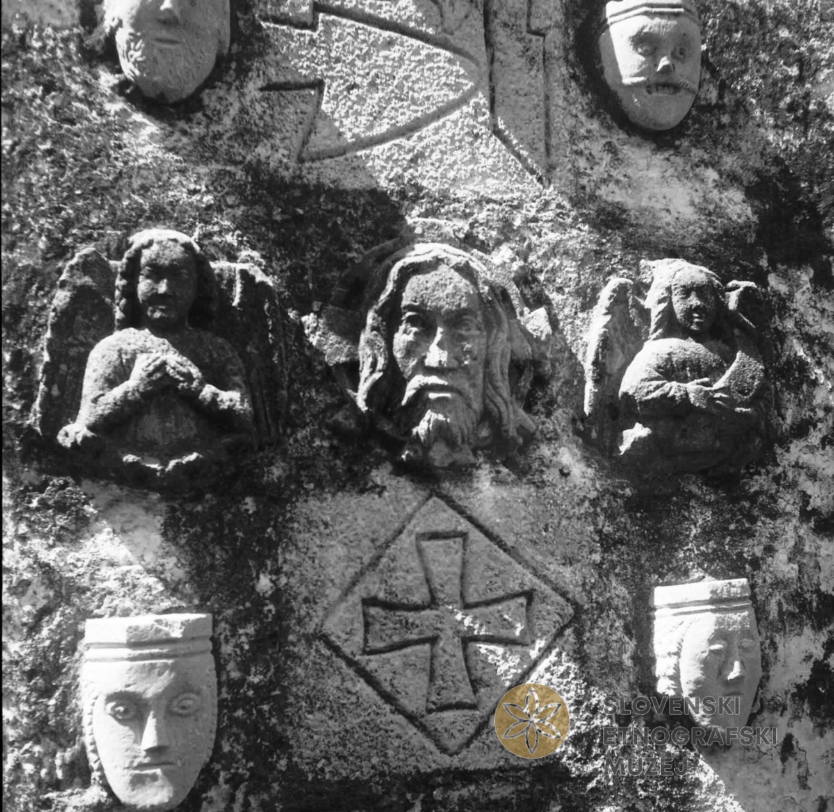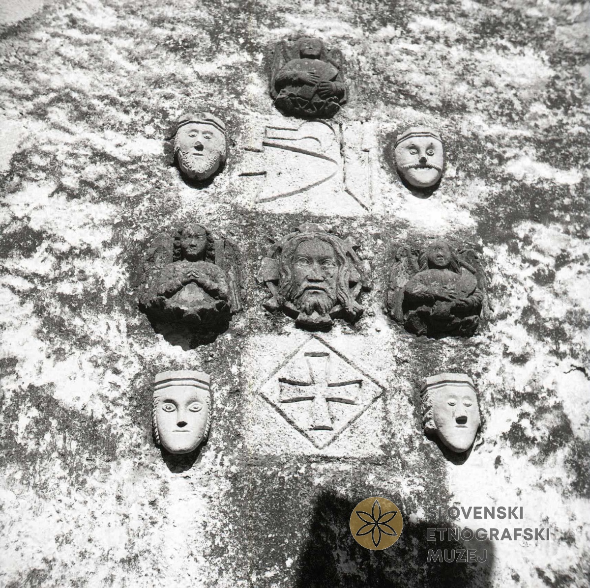 Sklepnik Matere Božje s tremi križi malteškega viteškega reda na steni cerkve na Slapu. Teren 15 -...