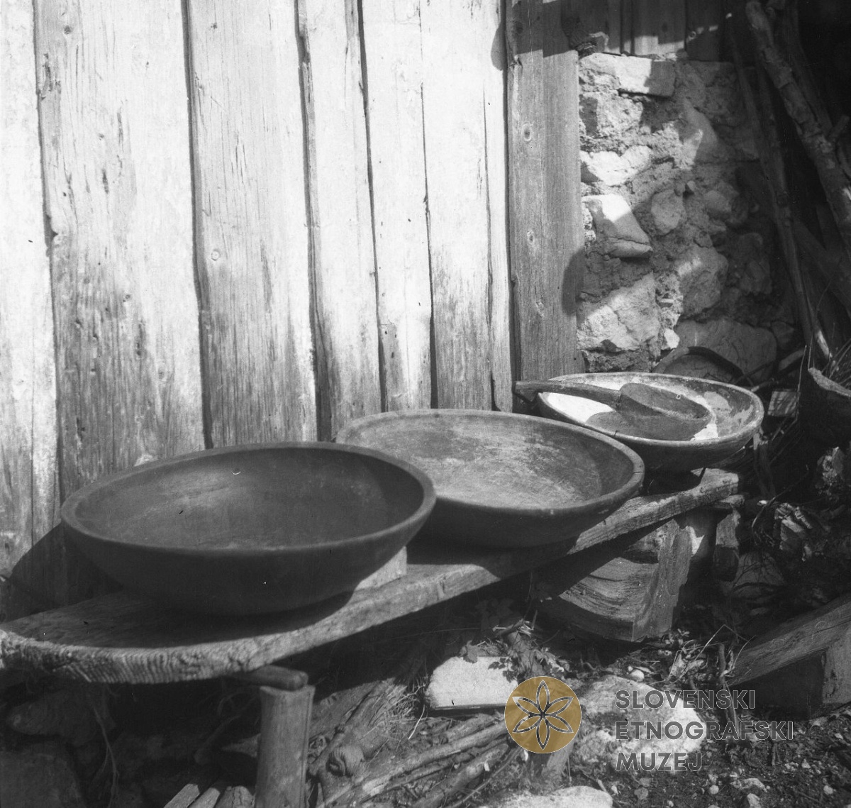 Stare lesene sklede za mleko. Delal jih je neki strgulc (strgalec) iz Sp. Soče. Na Skali, pri...