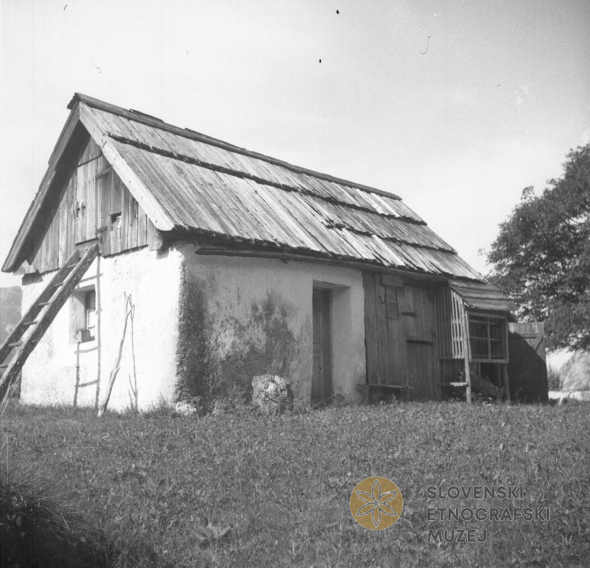 Hlev (Uančkov) na Skali. Na tramu ob vhodu letnica 1745. Teren 8 - Trenta - Bovec, 1.7. - 31.7.1952.