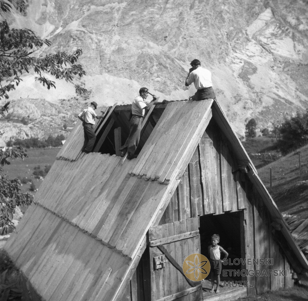 Štrolov hlev krijejo v Mišji vasi v Soči. Teren 8 - Trenta - Bovec, 1.7. - 31.7.1952.