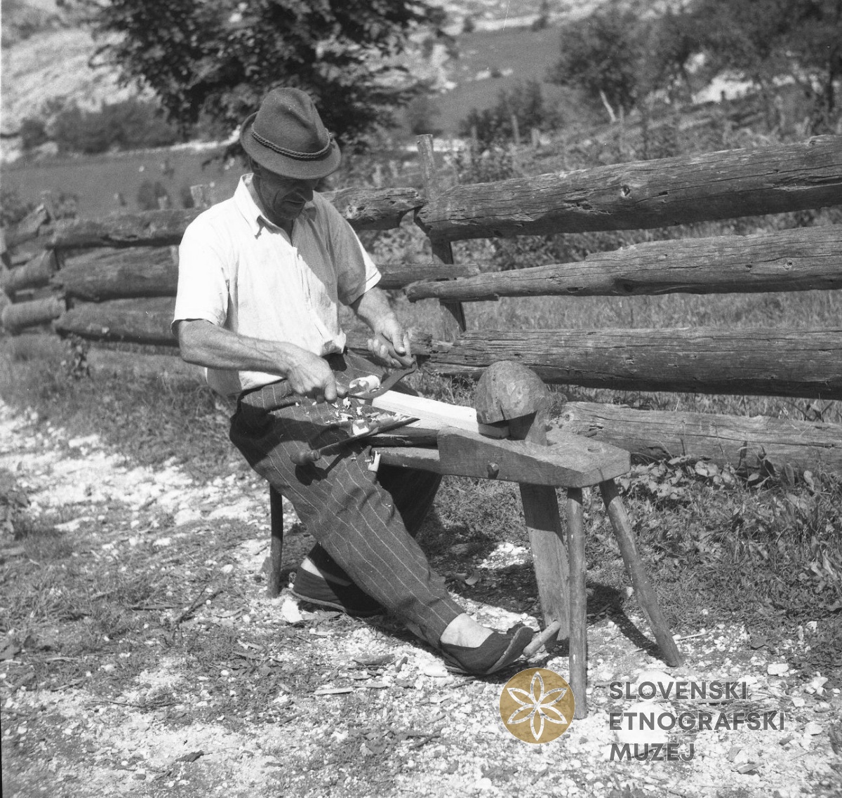 Kavs Anton, Soča 115, pri Mergeciči, obrezuje doge za štare na "stolu". Teren 8 - Trenta...