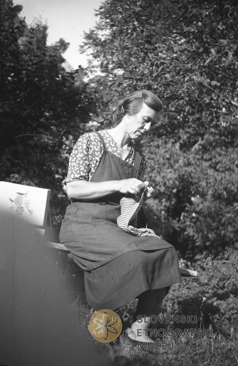 Marija Kravanja - Maticeva gospodinja, Na Skali 57 pred bajto poleg hiše. Tako obleko običajno...