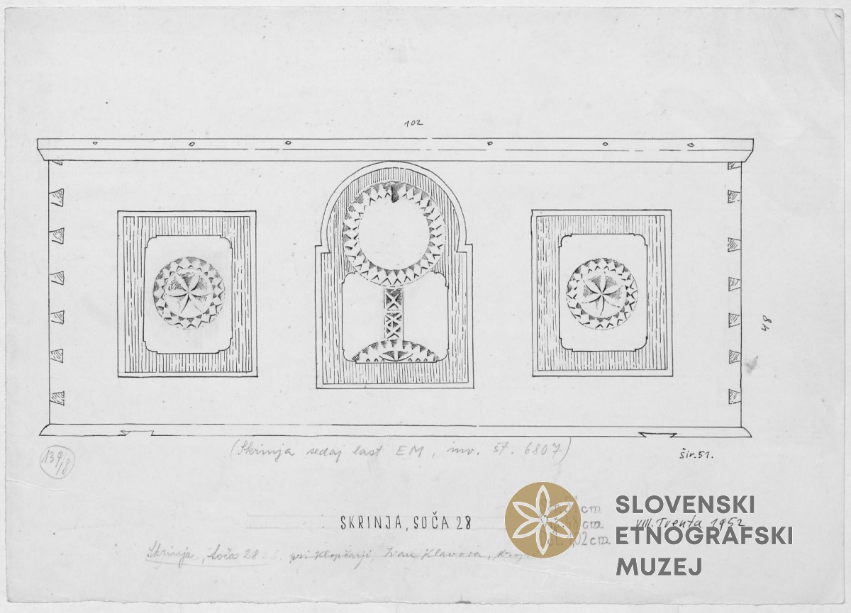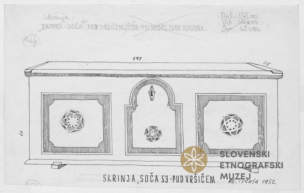 Skrinja (bajnka). Last EM, inv.št. 6807. Lastnik Ivan Klavora, pri Klopčarju. Soča 28.