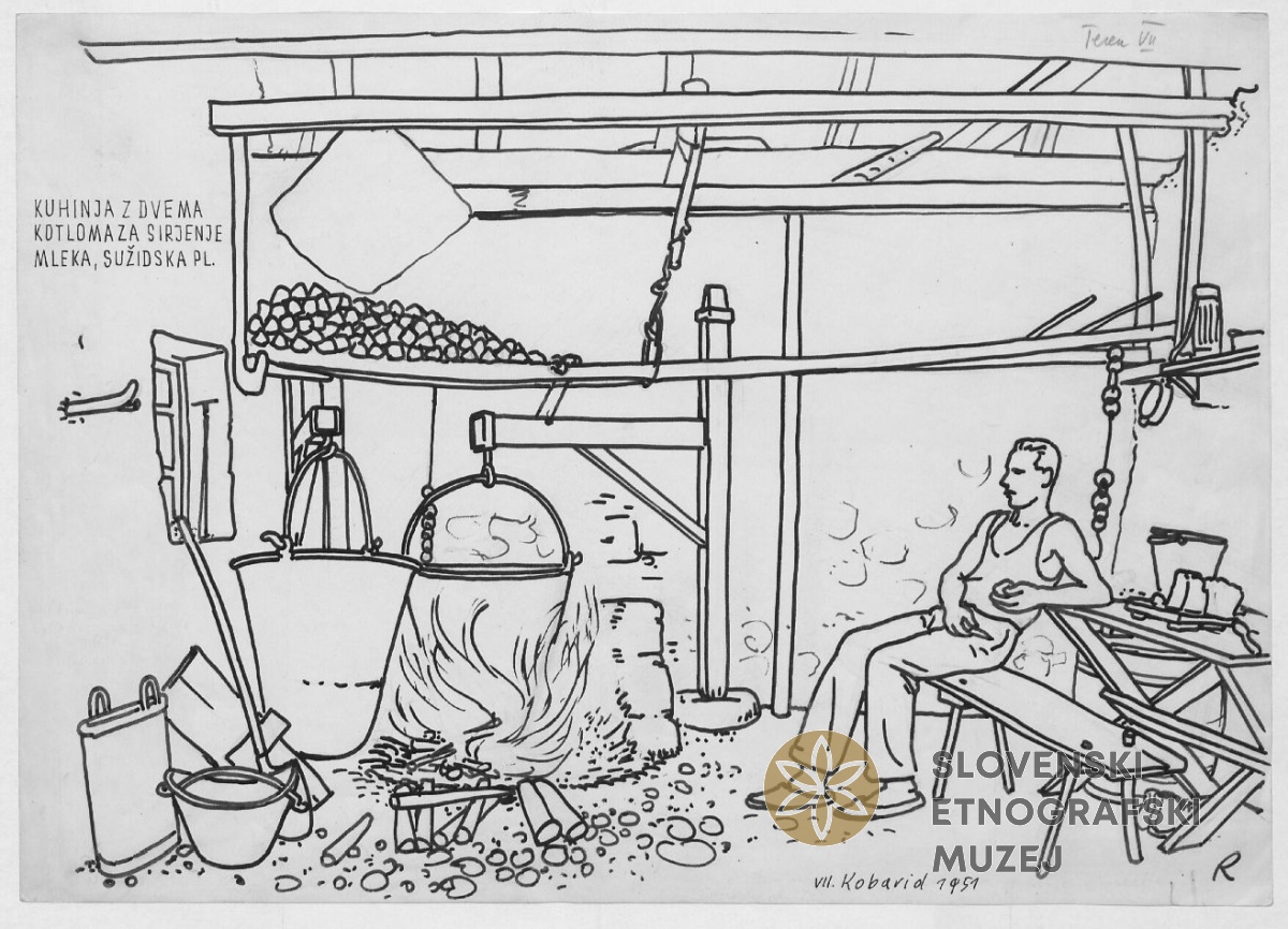 Mlekar na Sužidski planini meša zasirjeno mleko v kotlu. Teren 7 - Kobarid, 3.7. - 3.8.1951.