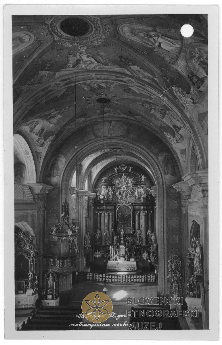 Sveta Trojica v Slovenskih Goricah. Na razglednici notranjščina cerkve. Med leti 1928 in 1947.
