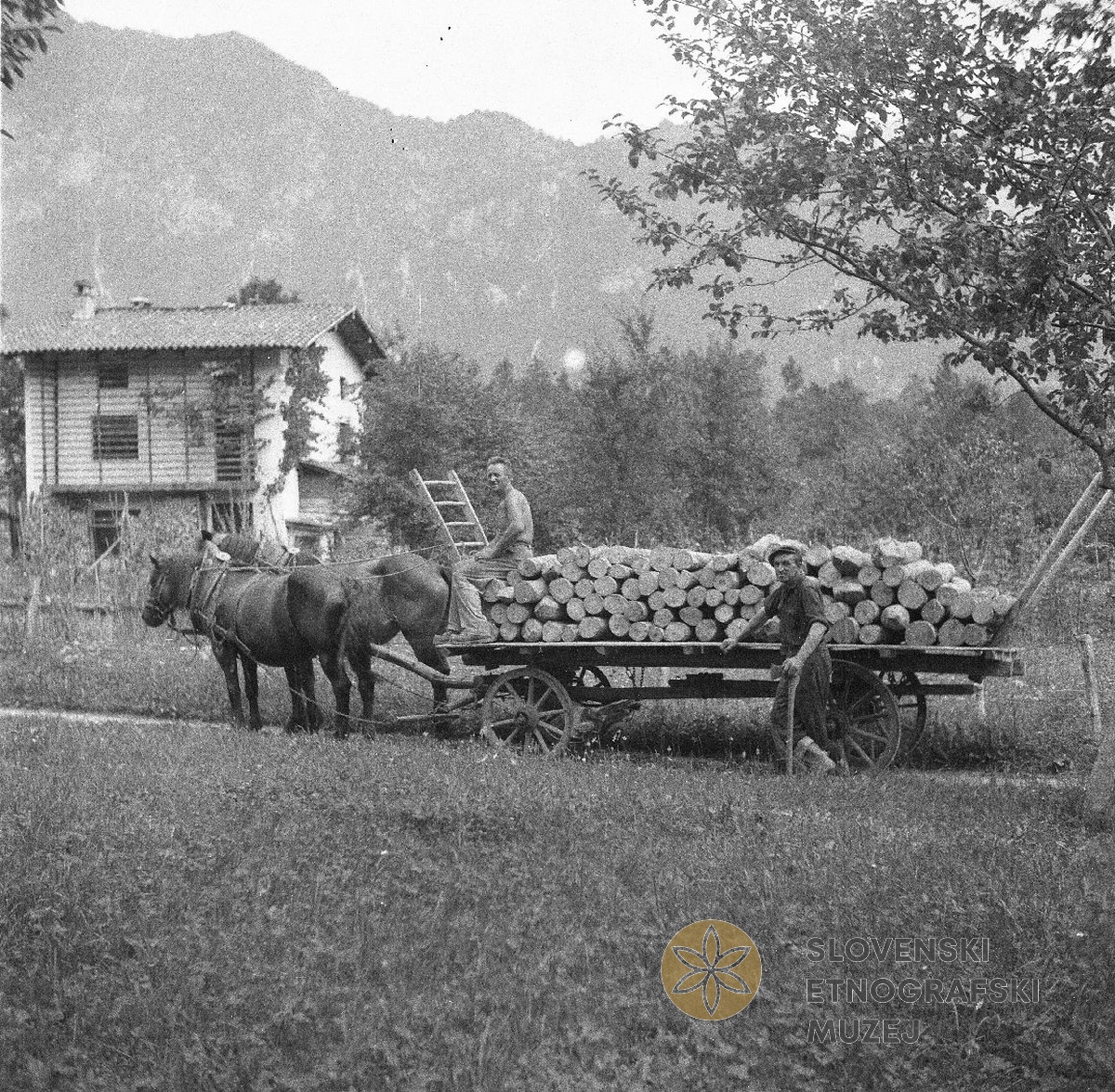 Na vozu s "školarji" vozijo drva za kurjavo. Pri Štajsu, Svino 8. Teren 7 - Kobarid, 3.7...