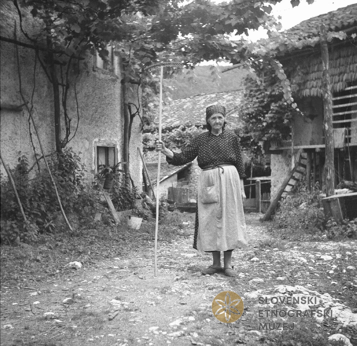 Konavec Katarina, stara 71 let, Svino 25, z grabljami, ki jih je izdelal njen nečak Ivan Konavec -...