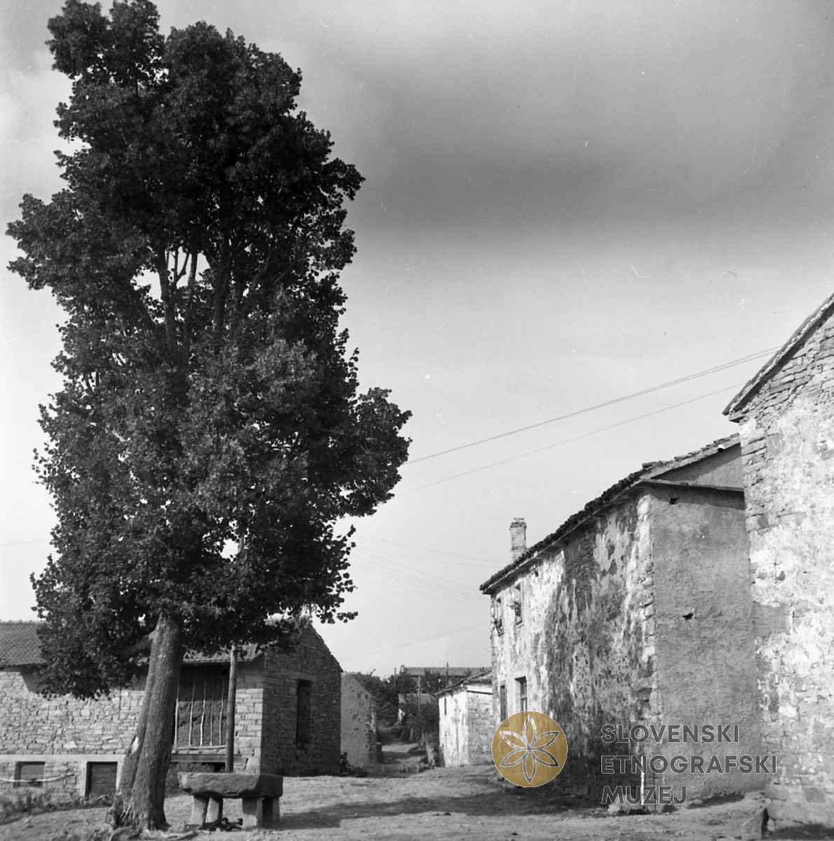 Tatre, lipa s kamnito mizo in nekaj hiš. Teren 12- Brkini, posneto v času terenskega dela od 1.-31...