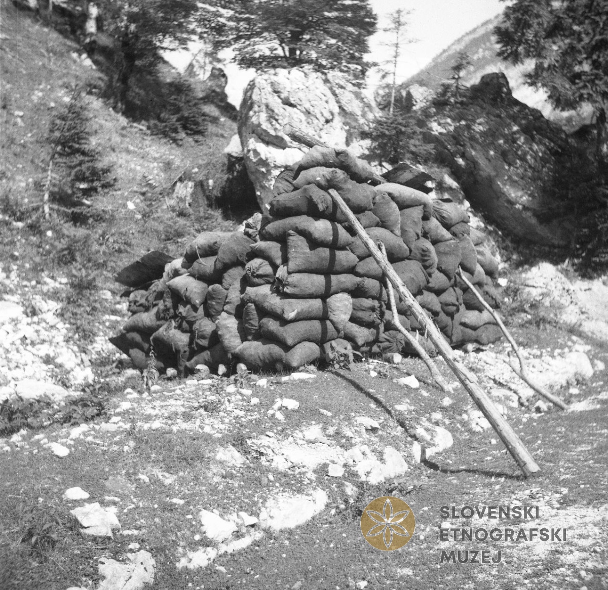 Vreče z ogljem ob cesti v Trenti. Teren 8 - Trenta - Bovec, 1.7. - 31.7.1952.