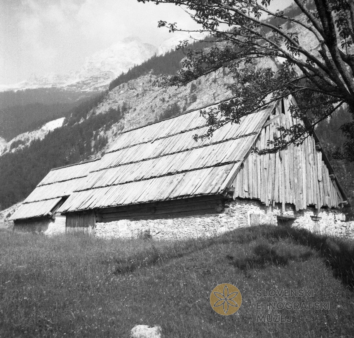 Štalo (hlev) delajo, Trenta 50, pri Fejanu. Dobro vidno ostrešje "cimper". Teren 8 -...
