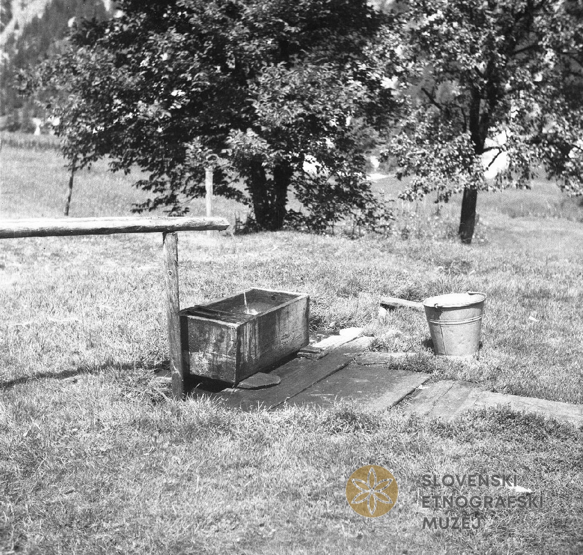 Po žlebih speljana voda teče pri koritu v "em?r" (=eimer, lavor), Zadnjica - Trenta...