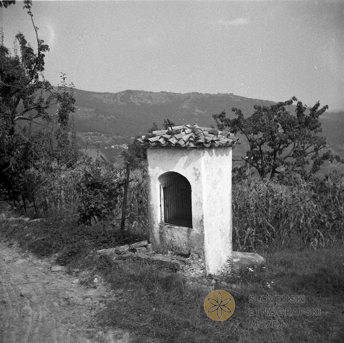 Kapelica ("pil"), Vrhovlje (v ozadju Brdce). Teren 10- Goriška Brda (31.7.-31.8.1953)...