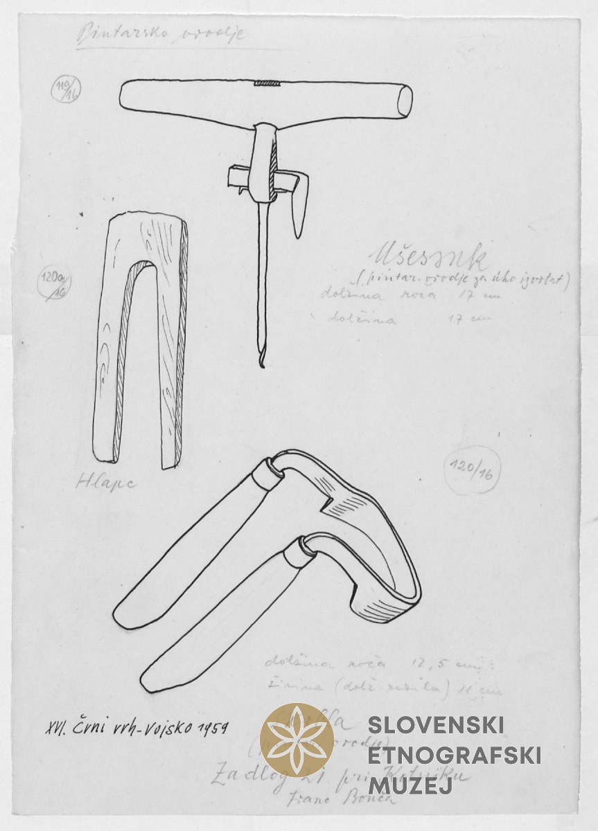 "Ušes?nk" (pintarsko orodje za uho izvrtat), Zadlog 21, pri Kotniku, Franc Bonča...