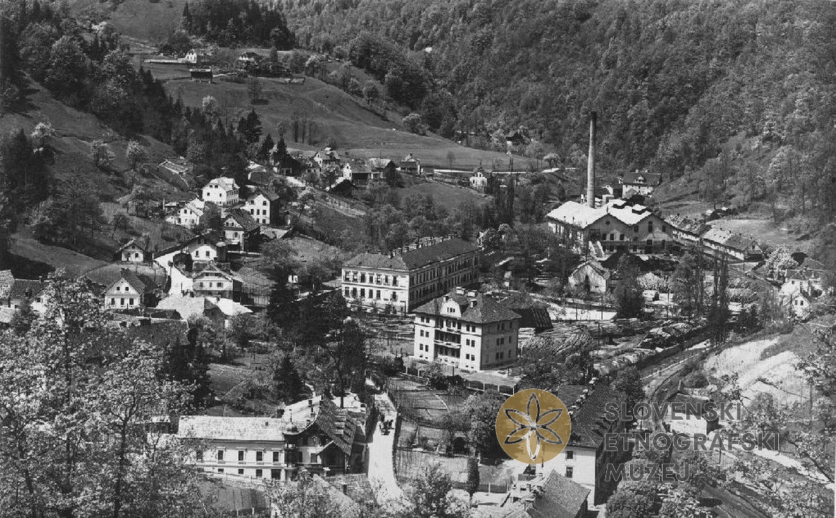 Naselje Zagorje ob Savi s cerkvijo, v ozadju hrib Javor, Spodnja Štajerska.