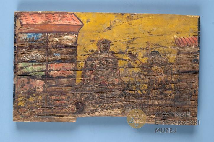 Job na gnoju. Inv. št. 7109; 14 x 23 cm; končnica je bila najdena v okolici Lučin. V četrtinski višini končnice so med figurama ostanki letnice 1866. Na Koroškem in Gorenjskem je Job postal zavetnik čebelarjev vsaj že v poznem 18. stoletju, na zahodnem Štajerskem najbrž šele v 19. stoletju. Domnevamo, da so ga povezali s čebelarstvom zaradi pesmi, v kateri so se črvi-zlatniki v rokah njegove žene spremenili v ose; te pa so imele v starejšem kmečkem besednem zakladu tudi skupno ime s čebelami: muhe. Oseba z imenom Job nastopa v Jobovi knjigi Svetega pisma stare zaveze; po prerekanju s satanom o Jobovi resnični pobožnosti ga Bog brezobzirno prepusti neznanskim nesrečam, oziroma satanovi oblasti češ, kljub vsemu hudemu naj bi Job ne preklinjal Boga. Od biblijske vsebine je na upodobitvah na končnicah ostal le Job, ki poln uljesov sedi na smetišču (gnoju) in žena, ki mu reče naj prekolne Boga in umre; godec ali godci so prišli v zgodbo iz grškega Jobovega apokrifa (tako je Job v severozahodni Evropi v 15. in 16. stoletju postal zavetnik glasbenikov) in nato po neki predlogi v zavest slikarjev končničarjev, kjer se je predstava združila še s čebelami in kranjskim čebelnjakom na upodobitvah (gl. Slovenske ljudske pesmi II, Ljubljana 1981, str. 16-21; L. Kretzenbacher, Hiob als Schutzpatron der slowenischen Imker, v: Bunte Bilder am Bienenhaus, Malereien aus Slowenien, Bayerisches Nationalmuseum München 1991, str. 31-37). Končnica kljub slabi ohranjenosti še kaže številne slogovne značilnosti Selške delavnice.