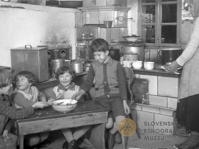 Nagličevi otroci pri večerji v domači kuhinji okoli leta 1927.