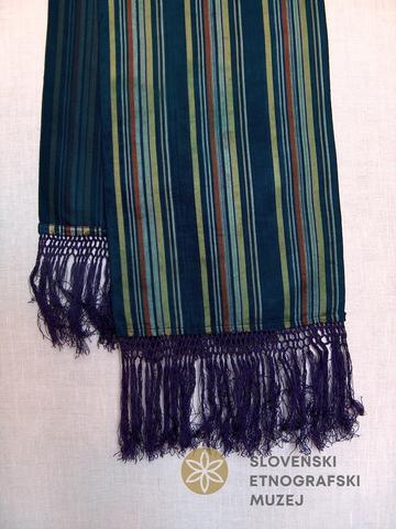 Poletna ruta (šerpa) iz vzorčasto tkane svile, Bled, prva polovica 20. stoletja. Industrijski izdelek, velikost brez res 26 cm X 284 cm, dolžina res 14 cm.