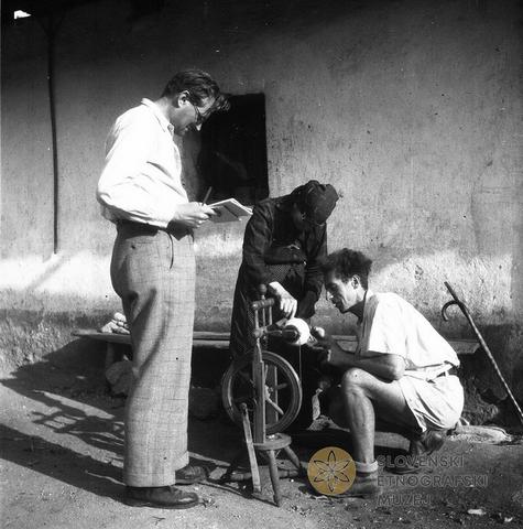 Tov. Matičetov in dr. Hrovatin pri izpraševanju Gorenjščkove matere, Polica.