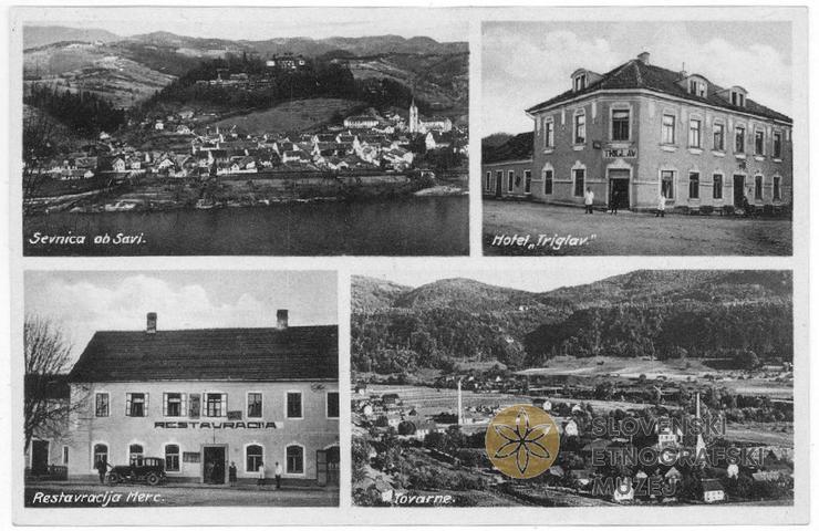 Na razglednici Sevnica ob Savi, Hotel Triglav, Restavracija Merc in tovarne.