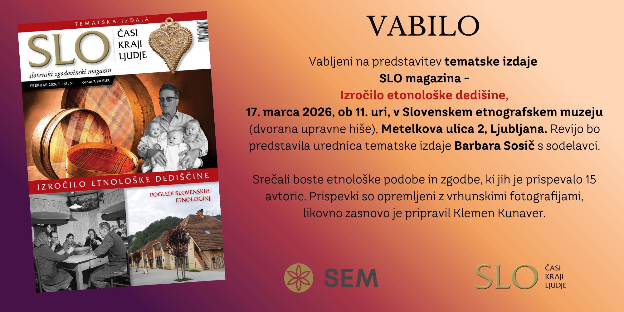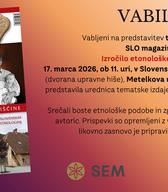 Vabljeni na predstavitev posebne izdaje SLO magazina: Izročilo etnološke dediščine. SLO izhaja petkrat letno, od teh je ena številka tematsko obarvana - letošnja v ospredje postavlja slovensko etnologijo.
