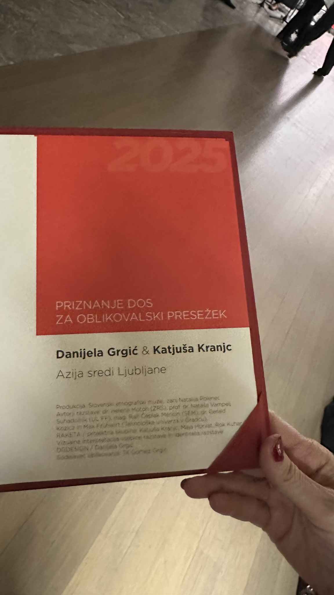 ”Priznanje oblikovalski presežek v letu 2025 Društvo oblikovalcev Slovenije podeljuje ustvarjalcem celovite podobe razstave Azija sredi Ljubljane: Danijeli Grgić, Katjuši Kranjc, Maji Horvat, Roku Kuharju. Gre za izjemno kompleksno in strokovno zahtevno delo, ki je vezano predvsem na poglobljeno razumevanje povsem tujega okolja, tamkajšnje kulture in pretehtano predstavitev v našem lokalnem okolju. Številni eksponati bi morda zahtevali vsak zase lastno interpretacijo, so pa vendar v sklopu celovitega projekta avtonomno oživeli pred slovensko javnostjo.”
