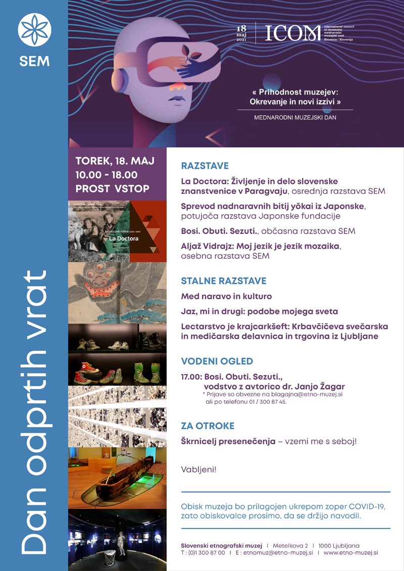 Od aprila naprej sta v razstavni hiši SEM na ogled dve novi razstavi. Razstava La Doctora: Življenje in delo slovenske znanstvenice v Paragvaju, ki jo je zasnoval SEM, je posvečena dr. Branislavi Sušnik (1920 – 1996), pomembni raziskovalki slovenskega porekla, ki je svojo znanstveno in raziskovalno delo s področja etnologije, antropologije in etnolingvistike posvetila staroselskim ljudstvom Paragvaja. Potujoča razstava Japonske fundacije Sprevod nadnaravnih bitij yōkai iz Japonske pa je svojo pot po svetu začela prav v Slovenskem etnografskem muzeju 22. aprila in prvič slovenski publiki razkriva edinstveno japonsko kulturo yōkaija o nadnaravnih skrivnostnih bitjih oziroma pošastih, upodobljenih na zvitkih in lesoreznih tiskih ter v drugih medijih.