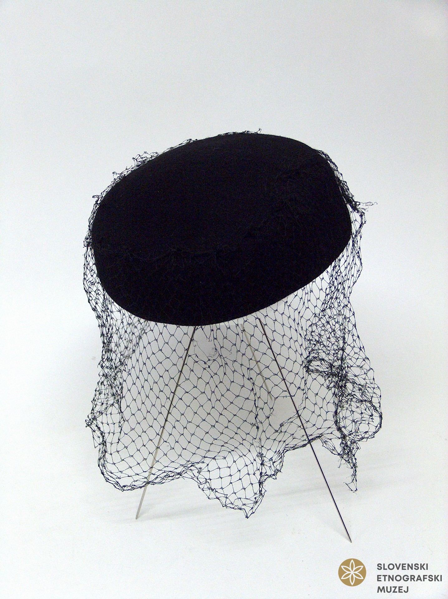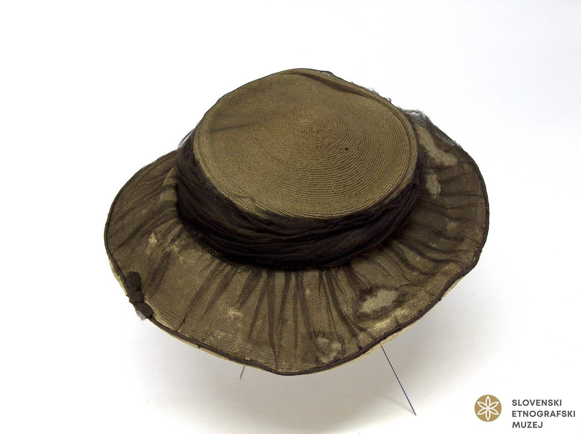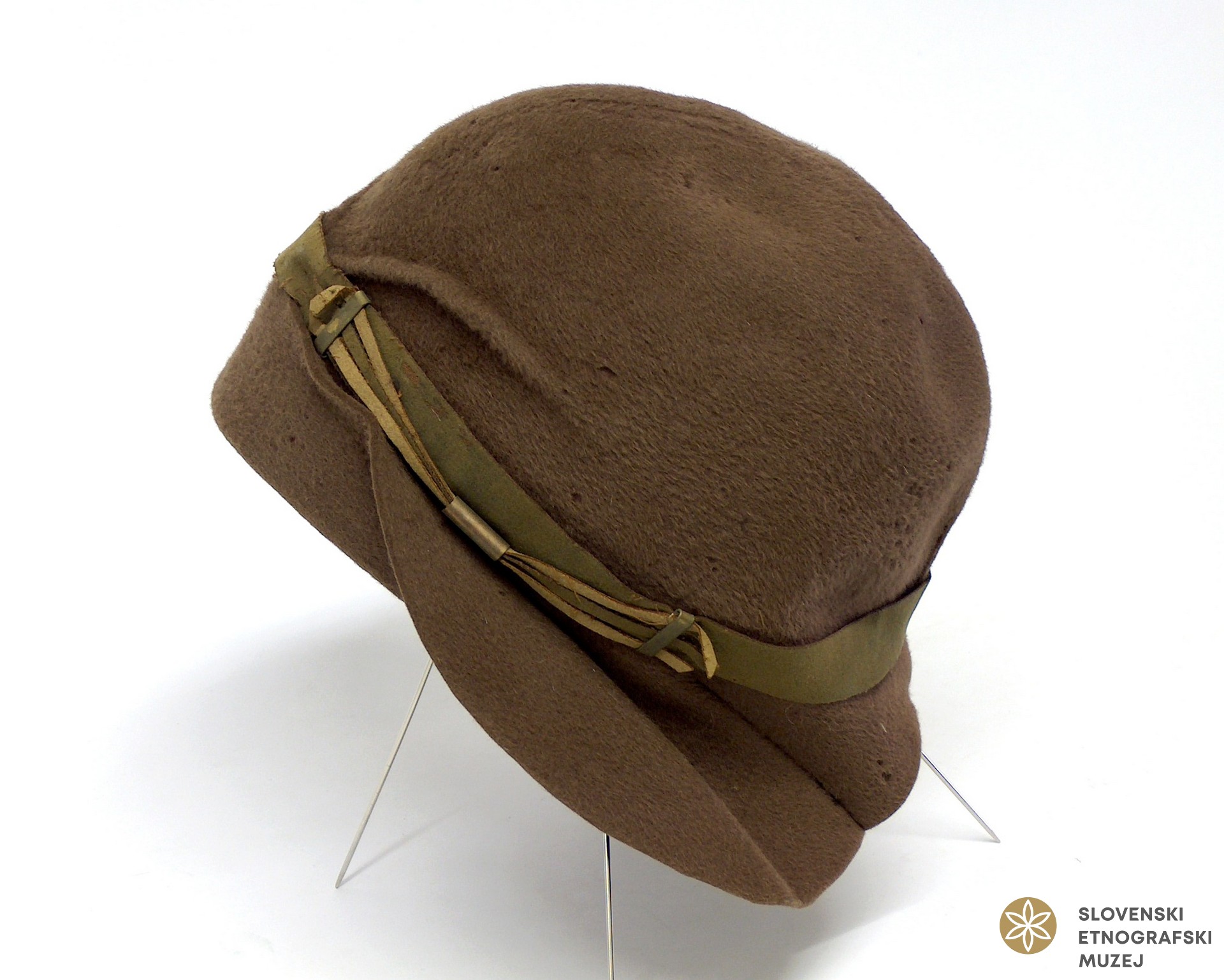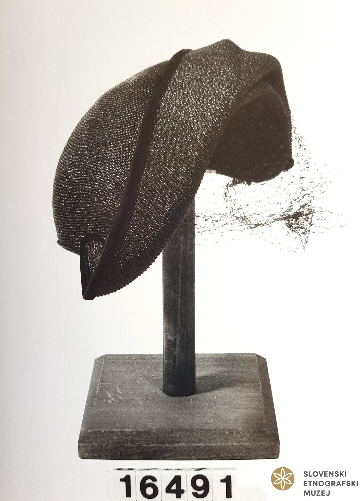 Klobuk iz rjave klobučevine, z nizkim vtisnjenim oglavjem in s posebej krojenimi, navzgor obrnjenimi krajci. Klobuk je bil preoblikovan iz moškega klobuka med 2. svetovno vojno / Žiri v Poljanski dolini / iz zbirke SEM / foto: J. Žagar. Žensko temensko pokrivalo iz svetlo rjavega žameta, oblikovan v dveh zamaknjenih S linijah; na površini pritrjena vlakna (ali peresa).  Na podlagi napis švicarskega izdelovalca / Ljubljana / iz zbirke SEM / foto: J. Žagar. Ženski priležni klobuk asimetrične oblike, brez krajcev; narejen iz slamnate tkanine, podložen s svilo; iz delavnice modistke M. Sark / Ljubljana /  iz zbirke SEM / foto: J. Žagar. Žensko pokrivalo za teme in zatilje iz svetlečih modrikasto črnih kitic, z dodato mrežico za čelo in oči; iz delavnice modistke Mimi Sark / Ljubljana / iz zbirke SEM / foto: J. Žagar. Ženski klobuk iz rjavega volnenega kosmatenega blaga, z okroglim priležnim oglavjem in mehkimi krajci; konfekcijski izdelek. V 60. letih 20. stoletja ga je nosila gimnazijska profesorica / Ljubljana / iz zbirke SEM / foto: J. Žagar. Ženski klobuk iz črne polsti z nizkim ravnim oglavjem, okrašen s širokim svilenim trakom; pražnje pokrivalo šivilje in žene strojevodje, v rabi med svetovnima vojnama in kasneje / Ljubljana, Reka (Hrv.) / iz zbirke SEM / foto: J. Žagar. Ženski meščanski klobuk s plašnicami; iz 1. pol. 19. stoletja/ neznanega izvira / iz zbirke SEM / foto: J. Žagar.  Žensko temensko pokrivalo iz umazano bele klobučevine, utrjeno z vstavljeno žico, z okrasnimi stiliziranimi cveti iz enakega tvoriva in elastiko za pritrjevanje; iz 50. let 20. stoletja / Ljubljana / iz zbirke SEM / foto: J. Žagar. Ženski klobuk iz temno modre klobučevine, z nizkim oglavjem, širokimi krajci ter svilenim okrasnim trakom. Klobuk je bil pred ali med 2. svetovno vojno preoblikovan / Žiri v Poljanski dolini / iz zbirke SEM / foto: J. Žagar. Ženski slamnik iz slamnatih kitic, z ravnim vrhom na oglavju in z mehkimi asimetričnimi krajci; pokrivalo je v celoti prekrito z mehkim sivim tilom. Pred 1. svetovno vojno ga je nosila modistka / Ljubljana / iz zbirke SEM / foto: J. Žagar. Ženski slamnik iz črnih slamnatih trakov, z mehkim oglavjem in utrjenimi asimetričnimi krajci / Ljubljana / iz zbirke SEM / foto: J. Žagar. Ženski slamnik iz rjavih slamnatih kitic, z nizkim oglavjem in ožjimi krajci; iz delavnice modistke Mimi Sark. / Ljubljana / iz zbirke SEM / foto: J. Žagar. Ženski klobuk iz rjave kosmatene klobučevine z okroglim priležnim oglavjem in posebej krojenim čelnim zavihkom; iz delavnice modistke M. Sark / Ljubljana /  iz zbirke SEM / foto: J. Žagar. Ženski slamnik iz svetlega slamnatega prepleta, oblikovanega v nizko okroglo oglavje in posebej krojene široke krajce / Ljubljana / iz zbirke SEM / foto: J. Žagar. Ženski klobuk iz črne polsti, z okroglim oglavjem in izrazito navzgor upognjenimi krajci in asimetrično pentljo. Za žalno rabo je bil klobuk dopolnjen s črno tančico, ki je mehko zavezana okoli oglavja. V 30. letih 20. stoletja ga je nosila žena krojača / Ribnica / iz zbirke SEM / foto: J. Žagar. Ženski klobuček iz umazano bele klobučevine, z ravnim oglavjem in ravnim vrhom, brez krajcev. Pokrivalo je uporabljala žena učitelja / Zalog pri Ljubljani / iz zbirke SEM / foto: J. Žagar. Ženski klobuček iz črne klobučevine, z ravnim oglavjem in ravnim vrhom, brez krajcev. Pokrivalo je uporabljala žena učitelja / Zalog pri Ljubljani / iz zbirke SEM / foto: J. Žagar. Mehak dekliški klobuček iz karirastega volnenega blaga, z mehkim oglavjem in krajci; konfekcijski izdelek iz Italije. Sredi 90. let ga je v mrzlih dneh nosila ljubljanska gimnazijka / Ljubljana / iz zbirke SEM / foto: J. Žagar. Ženski slamnik iz svetlo rjavih, luknjičavo prepletenih slamnatih trakov; z nizkim priležnim oglavjem in asimetričnimi krajci. Slamnik je med svetovnima vojnama nosila žena gimnazijskega profesorja / Ljubljana / iz zbirke SEM / foto: J. Žagar. Otroški slamnik iz svetlečih temno modrih slamnatih trakov, z nizkim oglavjem, razširjenim v široke krajce. Pred 2. svetovno vojno je slamnik nosila deklica iz trgovske družine / Ljubljana / iz zbirke SEM / foto: J. Žagar.