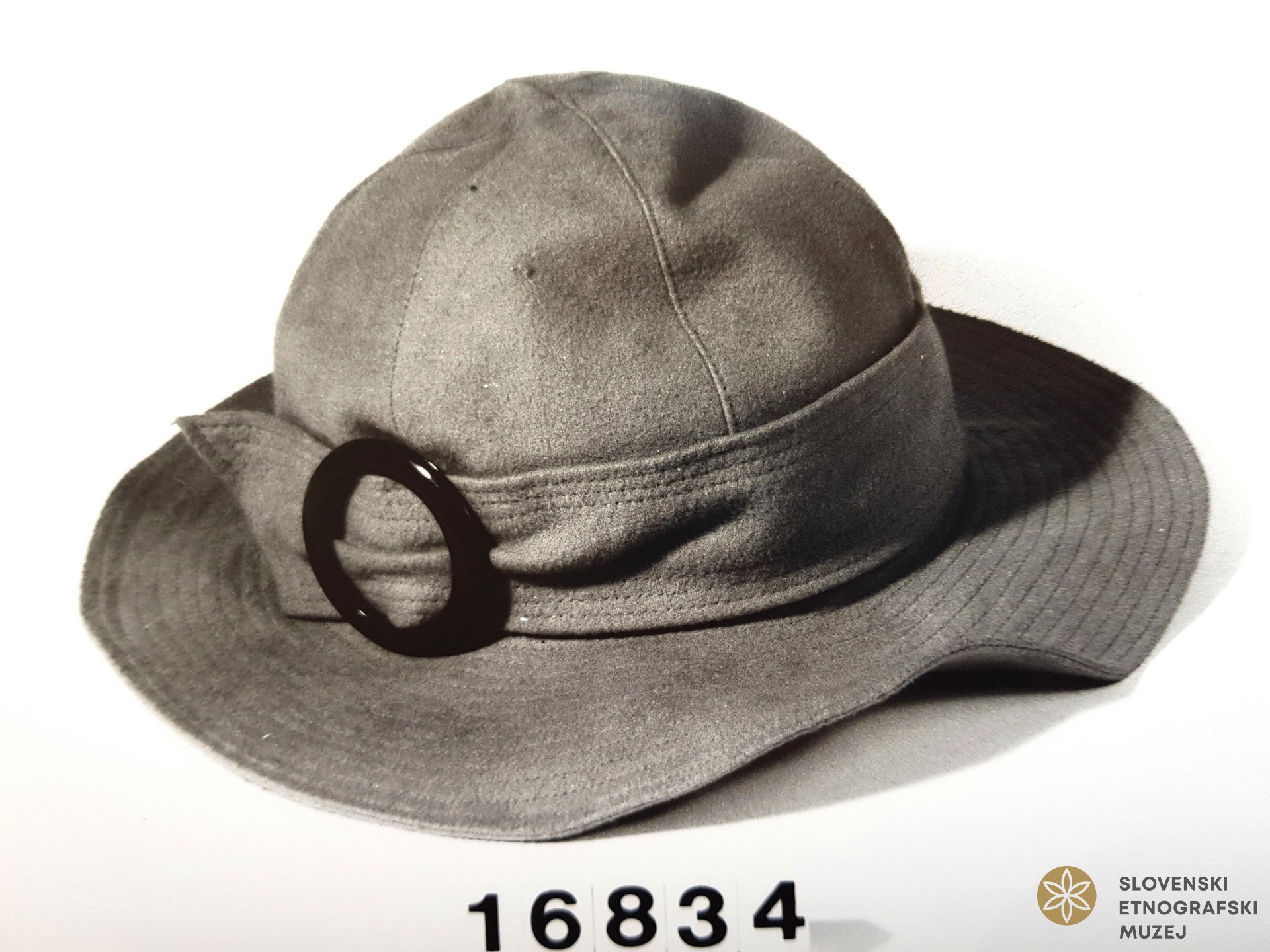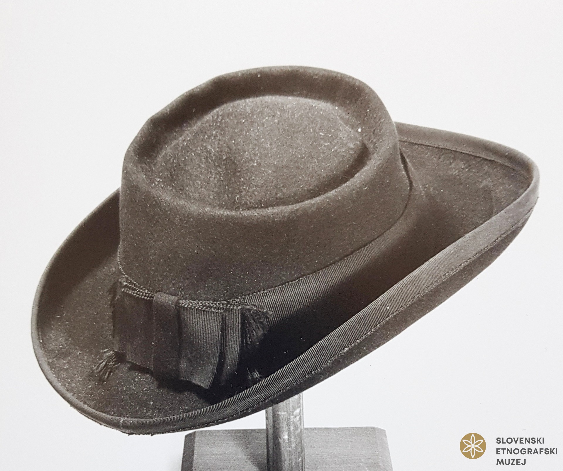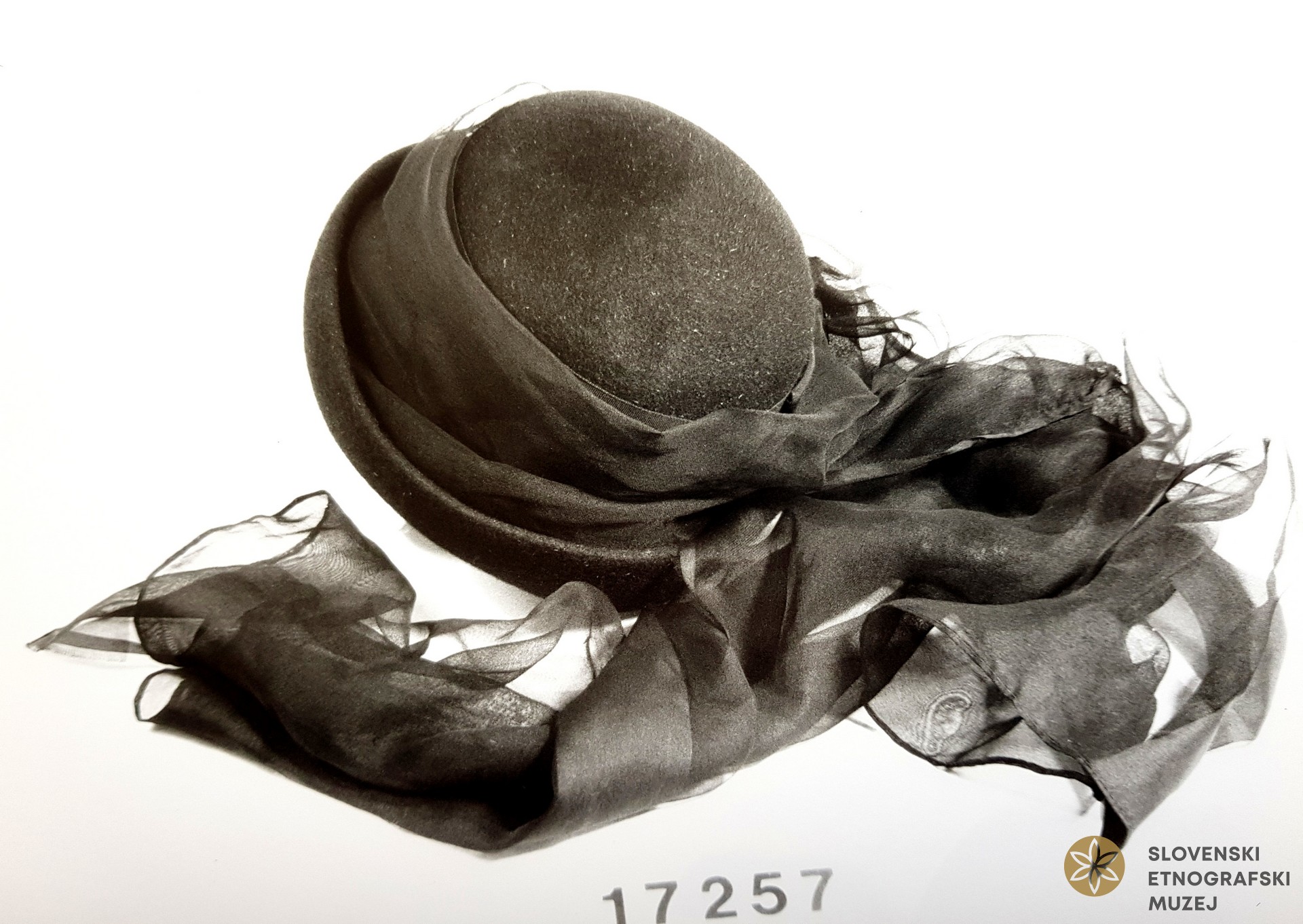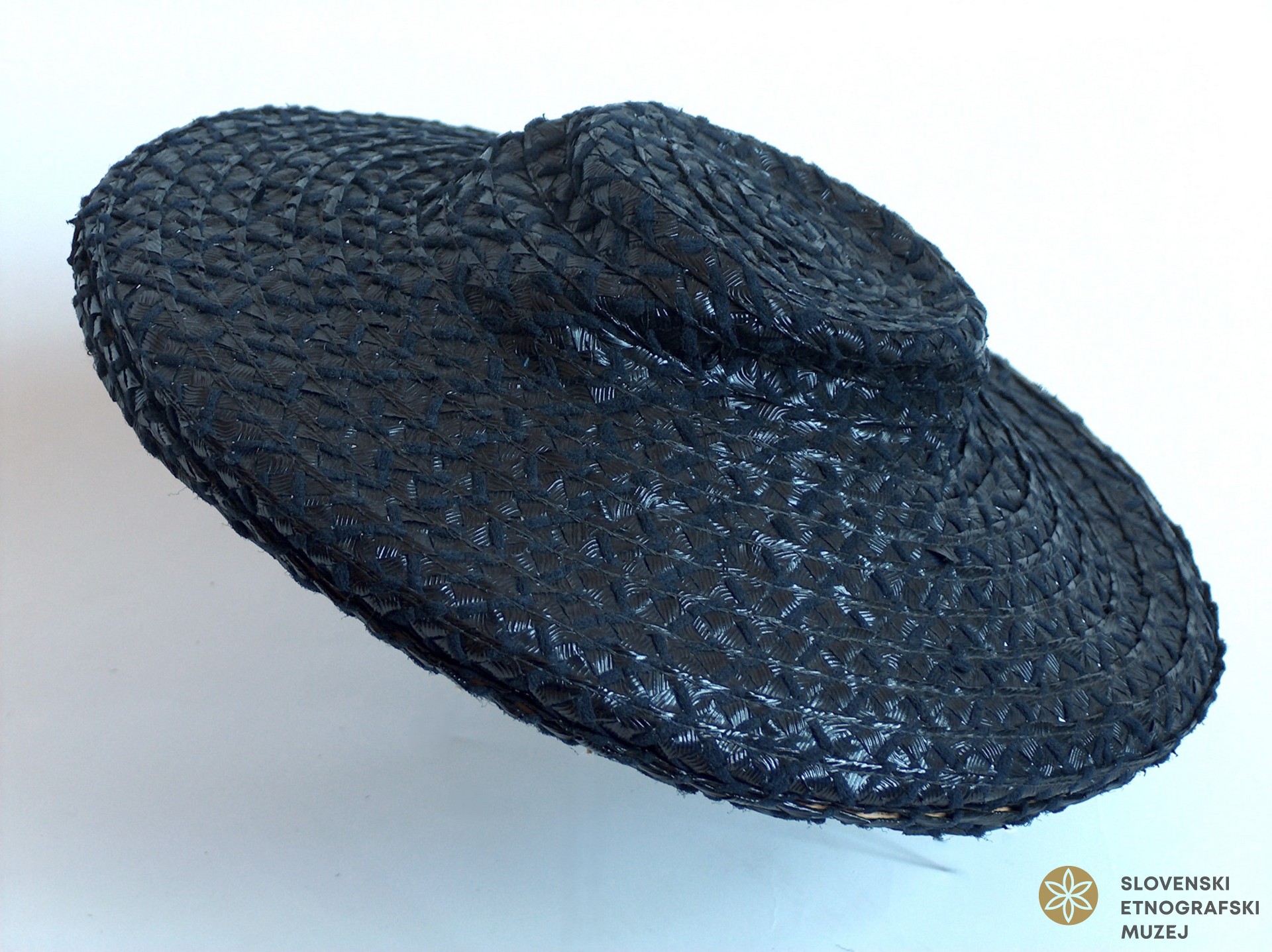 Klobuk iz rjave klobučevine, z nizkim vtisnjenim oglavjem in s posebej krojenimi, navzgor obrnjenimi krajci. Klobuk je bil preoblikovan iz moškega klobuka med 2. svetovno vojno / Žiri v Poljanski dolini / iz zbirke SEM / foto: J. Žagar. Žensko temensko pokrivalo iz svetlo rjavega žameta, oblikovan v dveh zamaknjenih S linijah; na površini pritrjena vlakna (ali peresa).  Na podlagi napis švicarskega izdelovalca / Ljubljana / iz zbirke SEM / foto: J. Žagar. Ženski priležni klobuk asimetrične oblike, brez krajcev; narejen iz slamnate tkanine, podložen s svilo; iz delavnice modistke M. Sark / Ljubljana /  iz zbirke SEM / foto: J. Žagar. Žensko pokrivalo za teme in zatilje iz svetlečih modrikasto črnih kitic, z dodato mrežico za čelo in oči; iz delavnice modistke Mimi Sark / Ljubljana / iz zbirke SEM / foto: J. Žagar. Ženski klobuk iz rjavega volnenega kosmatenega blaga, z okroglim priležnim oglavjem in mehkimi krajci; konfekcijski izdelek. V 60. letih 20. stoletja ga je nosila gimnazijska profesorica / Ljubljana / iz zbirke SEM / foto: J. Žagar. Ženski klobuk iz črne polsti z nizkim ravnim oglavjem, okrašen s širokim svilenim trakom; pražnje pokrivalo šivilje in žene strojevodje, v rabi med svetovnima vojnama in kasneje / Ljubljana, Reka (Hrv.) / iz zbirke SEM / foto: J. Žagar. Ženski meščanski klobuk s plašnicami; iz 1. pol. 19. stoletja/ neznanega izvira / iz zbirke SEM / foto: J. Žagar.  Žensko temensko pokrivalo iz umazano bele klobučevine, utrjeno z vstavljeno žico, z okrasnimi stiliziranimi cveti iz enakega tvoriva in elastiko za pritrjevanje; iz 50. let 20. stoletja / Ljubljana / iz zbirke SEM / foto: J. Žagar. Ženski klobuk iz temno modre klobučevine, z nizkim oglavjem, širokimi krajci ter svilenim okrasnim trakom. Klobuk je bil pred ali med 2. svetovno vojno preoblikovan / Žiri v Poljanski dolini / iz zbirke SEM / foto: J. Žagar. Ženski slamnik iz slamnatih kitic, z ravnim vrhom na oglavju in z mehkimi asimetričnimi krajci; pokrivalo je v celoti prekrito z mehkim sivim tilom. Pred 1. svetovno vojno ga je nosila modistka / Ljubljana / iz zbirke SEM / foto: J. Žagar. Ženski slamnik iz črnih slamnatih trakov, z mehkim oglavjem in utrjenimi asimetričnimi krajci / Ljubljana / iz zbirke SEM / foto: J. Žagar. Ženski slamnik iz rjavih slamnatih kitic, z nizkim oglavjem in ožjimi krajci; iz delavnice modistke Mimi Sark. / Ljubljana / iz zbirke SEM / foto: J. Žagar. Ženski klobuk iz rjave kosmatene klobučevine z okroglim priležnim oglavjem in posebej krojenim čelnim zavihkom; iz delavnice modistke M. Sark / Ljubljana /  iz zbirke SEM / foto: J. Žagar. Ženski slamnik iz svetlega slamnatega prepleta, oblikovanega v nizko okroglo oglavje in posebej krojene široke krajce / Ljubljana / iz zbirke SEM / foto: J. Žagar. Ženski klobuk iz črne polsti, z okroglim oglavjem in izrazito navzgor upognjenimi krajci in asimetrično pentljo. Za žalno rabo je bil klobuk dopolnjen s črno tančico, ki je mehko zavezana okoli oglavja. V 30. letih 20. stoletja ga je nosila žena krojača / Ribnica / iz zbirke SEM / foto: J. Žagar. Ženski klobuček iz umazano bele klobučevine, z ravnim oglavjem in ravnim vrhom, brez krajcev. Pokrivalo je uporabljala žena učitelja / Zalog pri Ljubljani / iz zbirke SEM / foto: J. Žagar. Ženski klobuček iz črne klobučevine, z ravnim oglavjem in ravnim vrhom, brez krajcev. Pokrivalo je uporabljala žena učitelja / Zalog pri Ljubljani / iz zbirke SEM / foto: J. Žagar. Mehak dekliški klobuček iz karirastega volnenega blaga, z mehkim oglavjem in krajci; konfekcijski izdelek iz Italije. Sredi 90. let ga je v mrzlih dneh nosila ljubljanska gimnazijka / Ljubljana / iz zbirke SEM / foto: J. Žagar. Ženski slamnik iz svetlo rjavih, luknjičavo prepletenih slamnatih trakov; z nizkim priležnim oglavjem in asimetričnimi krajci. Slamnik je med svetovnima vojnama nosila žena gimnazijskega profesorja / Ljubljana / iz zbirke SEM / foto: J. Žagar. Otroški slamnik iz svetlečih temno modrih slamnatih trakov, z nizkim oglavjem, razširjenim v široke krajce. Pred 2. svetovno vojno je slamnik nosila deklica iz trgovske družine / Ljubljana / iz zbirke SEM / foto: J. Žagar.